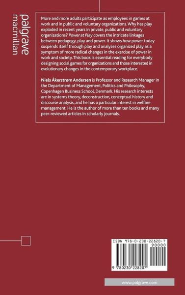 More and more adults participate as employees in games at work and in public and voluntary organizations. Power at play covers the intricate linkages between pedagogy, play and power. It shows how power today suspends itself through play and analyzes organized play as a symptom of more radical changes of the exercise of power in work and society.