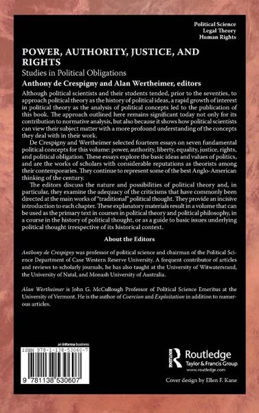 Introduction I. POWER 1. P. H. Partridge - Some Notes on the Concept of Power 2. Anthony de Crespigny - Power and Its Forms Select Bibliography II. AUTHORITY 3. R. S. Peters-Authority 4. C. W. Cassinelli - Political Authority: Its Exercise and Possession Select Bibliography III. LIBERTY 5. K. J. Scott - Liberty, License, and not being Free 6. Gerald C. MacCallum, Jr. - Negative and Positive Freedom Select Bibliography IV. EQUALITY 7. John H. Schaar - Equality of Opportunity, and Beyond 8. John Charvet - The Idea of Equality as a Substantive Principle of Society Select Bibliography V. JUSTICE 9. D. D. Raphael - Conservative and Prosthetic Justice 10. John Rawls - Justice as Fairness Select Bibliography VI. RIGHTS 11. Margaret Macdonald - Natural Rights 12. Stuart M. Brown - Inalienable Rights Select Bibliography VII. POLITICAL OBLIGATION 13. Richard A. Wasserstrom - The Obligation to Obey the Law 14. Michael Walzer - The Obligation to Disobey Select Bibliography Index