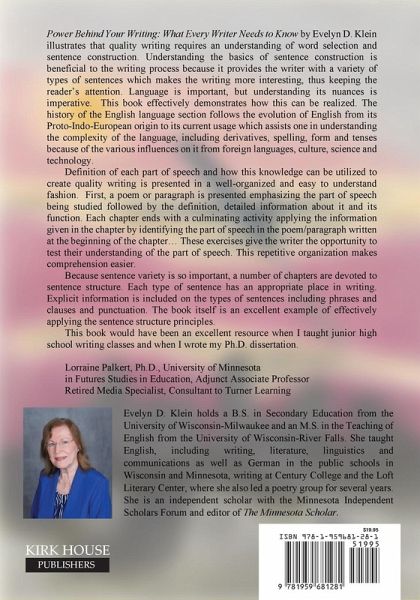 Power Behind Your Writing: What Every Writer Needs to Know by Evelyn D. Klein illustrates that quality writing requires an understanding of word selection and sentence construction. Understanding the basics of sentence construction is beneficial to the writing process because it provides the writer with a variety of types of sentences which makes the writing more interesting, thus keeping the reader's attention. Language is important, but understanding its nuances is imperative. This book effectively demonstrates how this can be realized. The history of the English language section follows the evolution of English from its Proto-Indo-European origin to its current usage which assists one in understanding the complexity of the language, including derivatives, spelling, form and tenses because of the various influences on it from foreign languages, culture, science and technology. Definition of each part of speech and how this knowledge can be utilized to create quality writing is presented in a well-organized and easy to understand fashion. First, a poem or paragraph is presented emphasizing the part of speech being studied, followed by the definition, detailed information about it, and its function. Each chapter ends with a culminating activity applying the information given in the chapter by identifying the part of speech in the poem/paragraph written at the beginning of the chapter... These exercises give the writer the opportunity to test their understanding of the part of speech. This repetitive organization makes comprehension easier. Because sentence variety is so important, a number of chapters are devoted to sentence structure. Each type of sentence has an appropriate place in writing. Explicit information is included on the types of sentences including phrases and clauses and punctuation. The book itself is an excellent example of effectively applying the sentence structure principles. This book would have been an excellent resource when I taught junior high school writing classes and when I wrote my Ph.D. dissertation. ~Lorraine Palkert, Ph.D., University of Minnesota in Futures Studies in Education, Adjunct Associate Professor Retired Media Specialist, Consultant to Turner Learning