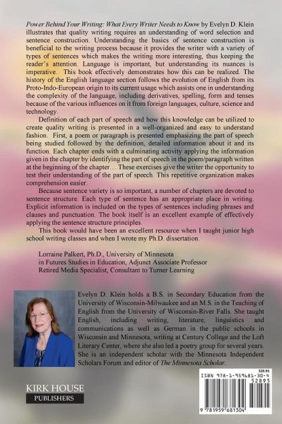 Power Behind Your Writing: What Every Writer Needs to Know by Evelyn D. Klein illustrates that quality writing requires an understanding of word selection and sentence construction. Understanding the basics of sentence construction is beneficial to the writing process because it provides the writer with a variety of types of sentences which makes the writing more interesting, thus keeping the reader's attention. Language is important, but understanding its nuances is imperative. This book effectively demonstrates how this can be realized. The history of the English language section follows the evolution of English from its Proto-Indo-European origin to its current usage which assists one in understanding the complexity of the language, including derivatives, spelling, form and tenses because of the various influences on it from foreign languages, culture, science and technology. Definition of each part of speech and how this knowledge can be utilized to create quality writing is presented in a well-organized and easy to understand fashion. First, a poem or paragraph is presented emphasizing the part of speech being studied, followed by the definition, detailed information about it, and its function. Each chapter ends with a culminating activity applying the information given in the chapter by identifying the part of speech in the poem/paragraph written at the beginning of the chapter... These exercises give the writer the opportunity to test their understanding of the part of speech. This repetitive organization makes comprehension easier. Because sentence variety is so important, a number of chapters are devoted to sentence structure. Each type of sentence has an appropriate place in writing. Explicit information is included on the types of sentences including phrases and clauses and punctuation. The book itself is an excellent example of effectively applying the sentence structure principles. This book would have been an excellent resource when I taught junior high school writing classes and when I wrote my Ph.D. dissertation. ~Lorraine Palkert, Ph.D., University of Minnesota in Futures Studies in Education, Adjunct Associate Professor Retired Media Specialist, Consultant to Turner Learning