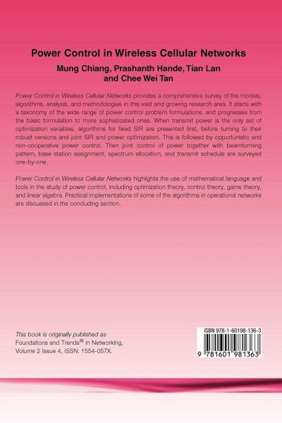 Power Control in Wireless Cellular Networks provides a comprehensive survey of the models, algorithms, analysis, and methodologies in this vast and growing research area. It starts with a taxonomy of the wide range of power control problem formulations, and progresses from the basic formulation to more sophisticated ones. When transmit power is the only set of optimisation variables, algorithms for fixed SIR are presented first, before turning to their robust versions and joint SIR and power optimization. This is followed by opportunistic and non-cooperative power control. Then joint control of power together with beamforming pattern, base station assignment, spectrum allocation, and transmit schedule are surveyed one by one. Power Control in Wireless Cellular Networks highlights the use of mathematical language and tools in the study of power control, including optimisation theory, control theory, game theory, and linear algebra. Practical implementations of some of the algorithms in operational networks are discussed in the concluding chapter.