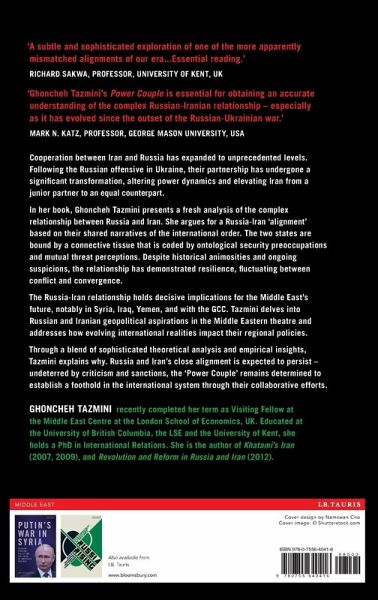 Cooperation between Iran and Russia has expanded to unprecedented levels. Following the Russian offensive in Ukraine, their partnership has undergone a significant transformation, altering power dynamics and elevating Iran from a junior partner to an equal counterpart. Russia's dependence on Iran in unexpected areas has caught observers by surprise. In her book, Ghoncheh Tazmini presents a fresh analysis of the complex relationship between Russia and Iran. She argues for a Russia-Iran 'alignment' based on their shared narratives of the international order. The two states are bound by connective tissue that is coded by ontological security preoccupations and mutual threat perceptions. Despite historical animosities and ongoing suspicions, the relationship has demonstrated resilience, fluctuating between conflict and convergence. The Iran-Russia relationship holds decisive implications for the Middle East's future, where their interests both overlap and diverge, notably in Syria, Iraq, Yemen, and with the GCC. Tazmini delves into Russian and Iranian geopolitical aspirations in the Middle Eastern theatre and addresses how evolving international realities impact their regional policies. Through a blend of sophisticated theoretical analysis and empirical insights, Tazmini explains why Moscow-Tehran relations are more durable than many in the Western world and the Middle East may perceive. Russia and Iran's close alignment is expected to persist - undeterred by criticism and sanctions, the 'Power Couple' remains determined to establish a foothold in the international system through their collaborative efforts.