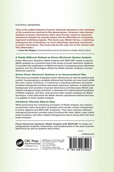 A Totally Different Outlook on Power Electronic System Analysis Power Electronic Systems: Walsh Analysis with MATLAB® builds a case for Walsh analysis as a powerful tool in the study of power electronic systems. It considers the application of Walsh functions in analyzing power electronic systems, and the advantages offered by Walsh domain analysis of power electronic systems. Solves Power Electronic Systems in an Unconventional Way This book successfully integrates power electronics as well as systems and control. Incorporating a complete orthonormal function set very much unlike the sine-cosine functions, it introduces a blending between piecewise constant orthogonal functions and power electronic systems. It explores the background and evolution of power electronics, and discusses Walsh and related orthogonal basis functions. It develops the mathematical foundation of Walsh analysis, and first- and second-order system analyses by Walsh technique. It also describes the Walsh domain operational method and how it is applied to linear system analysis. Introduces Theories Step by Step While presenting the underlying principles of Walsh analysis, the authors incorporate many illustrative examples, and include a basic introduction to linear algebra and MATLAB® programs. They also examine different orthogonal piecewise constant basis functions like Haar, Walsh, slant, block pulse functions, and other related orthogonal functions along with their time scale evolution. ¿ Analyzes pulse-fed single input single output (SISO) first- and second-order systems ¿ Considers stepwise and continuously pulse width modulated chopper systems ¿ Describes a detailed analysis of controlled rectifier circuits ¿ Addresses inverter circuits Power Electronic Systems: Walsh Analysis with MATLAB® is written for postgraduate students, researchers, and academicians in the area of power electronics as well as systems and control.