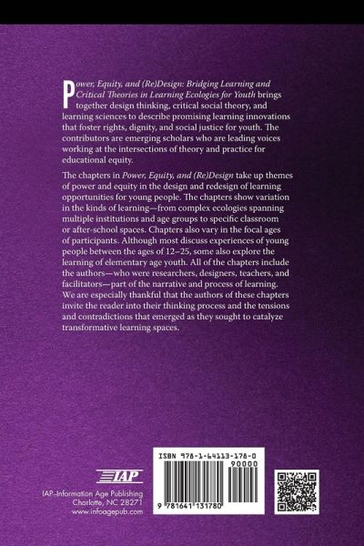 This volume brings together design thinking, critical social theory, and learning sciences to describe promising learning innovations that foster rights, dignity, and social justice for youth. The contributors are emerging scholars who are leading voices working at the intersections of theory and practice for educational equity. Chapters in this volume take up themes of power and equity in the design and redesign of learning opportunities for young people. The chapters show variation in the kinds of learning--from complex ecologies spanning multiple institutions and age groups to specific classroom or after-school spaces. Chapters also vary in the focal ages of participants. Although most discuss experiences of young people between the ages of 12-25, some also explore the learning of elementary age youth. All of the chapters include the authors--who were researchers, designers, teachers, and facilitators--part of the narrative and process of learning. We are especially thankful that the authors of these chapters invite the reader into their thinking process and the tensions and contradictions that emerged as they sought to catalyze transformative learning spaces.