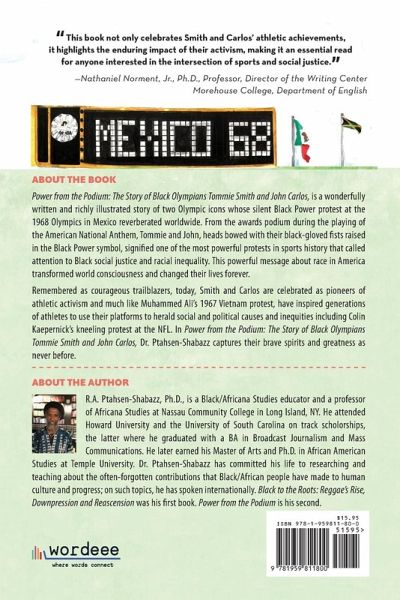 Power from the Podium: The Story of Black Olympians Tommie Smith and John Carlos, is a wonderfully written and richly illustrated story of two Olympic icons whose silent Black Power protest at the 1968 Olympics in Mexico reverberated worldwide. From the awards podium during the playing of the American National Anthem, Tommie and John, heads bowed with their black-gloved fists raised in the Black Power symbol, signified one of the most powerful protests in sports history that called attention to Black social justice and racial inequality. This powerful message about race in America transformed world consciousness and changed their lives forever. Remembered as courageous trailblazers, today, Smith and Carlos are celebrated as pioneers of athletic activism and much like Muhammed Ali's 1967 Vietnam protest have inspired generations of athletes to use their platforms to herald social and political causes and inequities including Colin Kaepernick's kneeling protest at the NFL. In Power from the Podium: The Story of Black Olympians Tommie Smith and John Carlos, Dr. Ptahsen-Shabazz captures their brave spirits and greatness as never before.