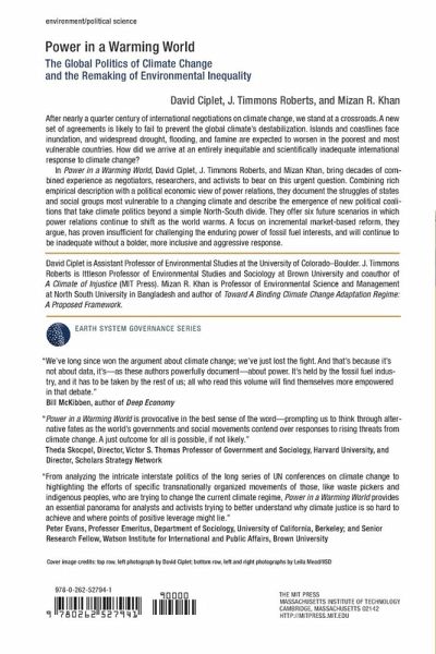 An examination of shifting global power dynamics in climate change politics, and how this affects our ability to achieve equitable and sustainable climate outcomes. After nearly a quarter century of international negotiations on climate change, we stand at a crossroads. A new set of agreements is likely to fail to prevent the global climate's destabilization. Islands and coastlines face inundation, and widespread drought, flooding, and famine are expected to worsen in the poorest and most vulnerable countries. How did we arrive at an entirely inequitable and scientifically inadequate international response to climate change? In Power in a Warming World, David Ciplet, J. Timmons Roberts, and Mizan Khan, bring decades of combined experience as negotiators, researchers, and activists to bear on this urgent question. Combining rich empirical description with a political economic view of power relations, they document the struggles of states and social groups most vulnerable to a changing climate and describe the emergence of new political coalitions that take climate politics beyond a simple North-South divide. They offer six future scenarios in which power relations continue to shift as the world warms. A focus on incremental market-based reform, they argue, has proven insufficient for challenging the enduring power of fossil fuel interests, and will continue to be inadequate without a bolder, more inclusive and aggressive response.