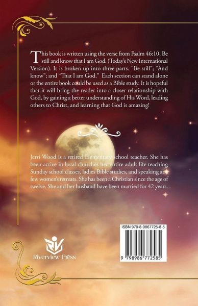 This book is written using the verse from Psalm 46:10, Be still and know that I am God. (Today's New International Version). It is broken up into three parts. "Be still"; "And know"; and "That I am God." Each section can stand alone or the entire book could be used as a Bible study. It is hopeful that it will bring the reader into a closer relationship with God, by gaining a better understanding of His Word, leading others to Christ, and learning that God is amazing! Jerri Wood is a retired Elementary school teacher. She has been active in local churches her entire adult life teaching Sunday school classes, ladies Bible studies, and speaking at a few women's retreats. She has been a Christian since the age of twelve. She and her husband have been married for 42 years.
