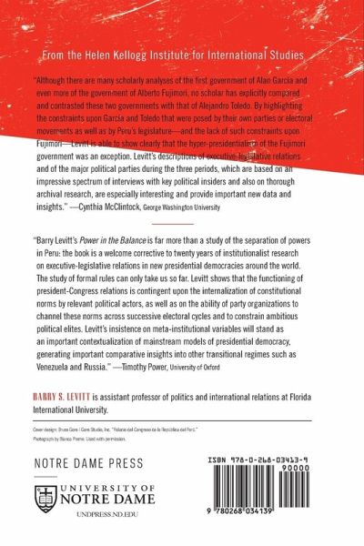 In Power in the Balance: Presidents, Parties, and Legislatures in Peru and Beyond, Barry S. Levitt answers urgent questions about executive power in "new" democracies. He examines in rich detail the case of Peru, from President Alan García's first term (1985-1990), to the erosion of democracy under President Alberto Fujimori (1990-2000), through the interim government of Valentín Paniagua (2000-2001) and the remarkable, if rocky, renewal of democracy culminating in Alejandro Toledo's 2001-2006 presidency. This turbulent experience with democracy brings into clear focus the functioning of formal political institutions-constitutions and electoral laws, presidents and legislatures, political parties and leaders-while also exposing the informal side of Peru's national politics over the course of two decades. Levitt's study of politics in Peru also provides a test case for his regional analysis of cross-national differences and change over time in presidential power across eighteen Latin American countries. In Peru and throughout Latin America, Levitt shows, the rule of law itself and the organizational forms of political parties have a stronger impact on legislative-executive relations than do most of the institutional traits and constitutional powers that configure the formal "rules of the game" for high politics. His findings, and their implications for improving the quality of new democracies everywhere, will surprise promoters, practitioners, and scholars of democratic politics alike.