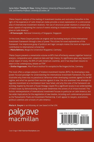 This book offers a unique analysis of bilateral investment treaties (BITs). By developing a new, power-focused paradigm for understanding the international investment framework, the author illustrates why there was no paradoxical behaviour when developing countries agreed to the BIT regime, and what has spurred their reaction against it now. She also examines how attempts to regulate investment at a multilateral level have failed, and why the rules of the framework are evolving. Inspired by the work of Susan Strange, Gwynn fills a significant lacuna in our understanding of these issues by demonstrating how power determines the actions of all those involved. This holistic reinterpretation of international investment focuses in particular on Latin America, but has wider implications for the negotiation of new treaties, including such controversial provisions as the Transatlantic Trade and Investment Partnership. It will appeal to lawyers, economists, political scientists and scholars ofLatin America.