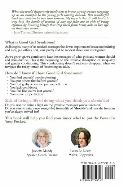What is Good Girl Syndrome? As little girls, many of us received messages that it was important to be accommodating and nice, put others first, look pretty and be modest about our intelligence. As we grow up, we continue to hear the messages of what girls and women should and shouldn't do. This is the beginning of the invisible absorption of inequality and gender conditioning. This conditioning doesn't suddenly disappear when we navigate the rocky terrain of becoming an adult. How do I know if I have Good Girl Syndrome? You find yourself people-pleasing You put others first before yourself You feel guilty when you put yourself first You lack confidence You feel like you've lost yourself You strive for perfection Sick of living a life of doing what you think you should do? Do you want to shine a light on the invisible messages you've taken on? Do you want to write a new story, rebel from a life of 'shoulds' and have the freedom you've always strived for? This book will help you find your inner rebel to put the Power In Your Pocket.
