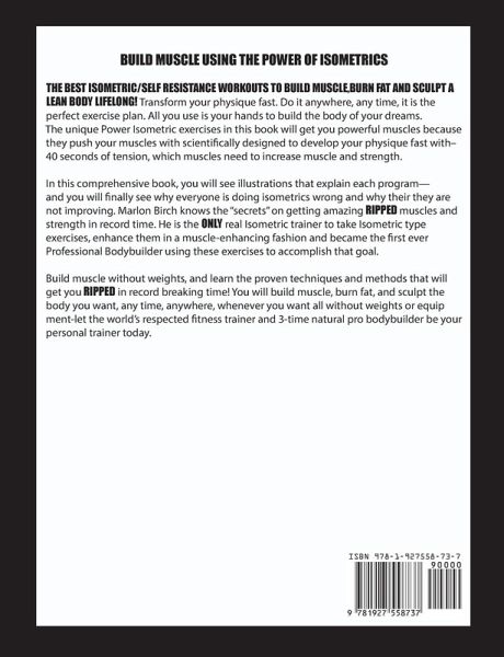 THE BEST ISOMETRIC/SELF RESISTANCE WORKOUTS TO BUILD MUSCLE,BURN FAT AND SCULPT A LEAN BODY LIFELONG! Transform your physique fast. Do it anywhere, any time, it is the perfect exercise plan. All you use is your hands to build the body of your dreams. The unique Power Isometric exercises in this book will get you powerful muscles because they push your muscles with scientifically designed to develop your physique fast with-40 seconds of tension, which muscles need to increase muscle and strength. In this comprehensive book, you will see illustrations that explain each program-and you will finally see why everyone is doing isometrics wrong and why their they are not improving. Marlon Birch knows the "secrets" on getting amazing RIPPED muscles and strength in record time. He is the ONLY real Isometric trainer to take Isometric type exercises, enhance them in a muscle-enhancing fashion and became the first ever Professional Bodybuilder using these exercises to accomplish that goal. Build muscle without weights, and learn the proven techniques and methods that will get you RIPPED in record breaking time! You will build muscle, burn fat, and sculpt the body you want, any time, anywhere, whenever you want all without weights or equipment-let the world's respected fitness trainer and 3-time natural pro bodybuilder be your personal trainer today.