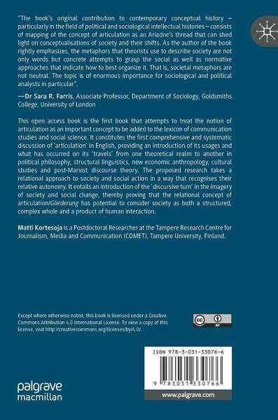 This open access book is the first book that attempts to treat the notion of articulation as an important concept to be added to the lexicon of communication studies and social science. It constitutes the first comprehensive and systematic discussion of 'articulation' in English, providing an introduction of its usages and what has occurred on its 'travels' from one theoretical realm to another in political philosophy, structural linguistics, new economic anthropology, cultural studies and post-Marxist discourse theory. The proposed research takes a relational approach to society and social action in a way that recognises their relative autonomy. It entails an introduction of the 'discursive turn' in the imagery of society and social change, thereby proving that the relational concept of articulation/Gliederung has potential to consider society as both a structured, complex whole and a product of human interaction.