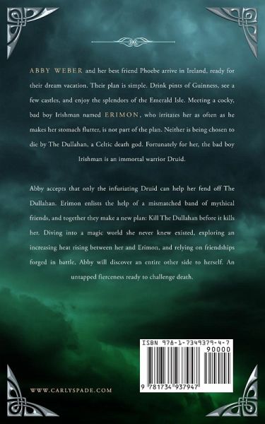 Abby Weber and her best friend Phoebe arrive in Ireland, ready for their dream vacation. Their plan is simple. Drink pints of Guinness, see a few castles, and enjoy the splendors of the Emerald Isle. Meeting a cocky, bad boy Irishman named Erimon, who irritates her as often as he makes her stomach flutter, is not part of the plan. Neither is being chosen to die by The Dullahan, a Celtic death god. Fortunately for her, the bad boy Irishman is an immortal warrior Druid. Abby reluctantly accepts that only the Druid can help her fend off The Dullahan. Erimon enlists the help of a mismatched band of mythical friends, and together they make a new plan: Kill The Dullahan before it kills her. Diving into a magic world she never knew existed, exploring an increasing heat rising between her and Erimon, and relying on friendships forged in battle, Abby will discover an entire other side to herself. An untapped fierceness ready to challenge death.