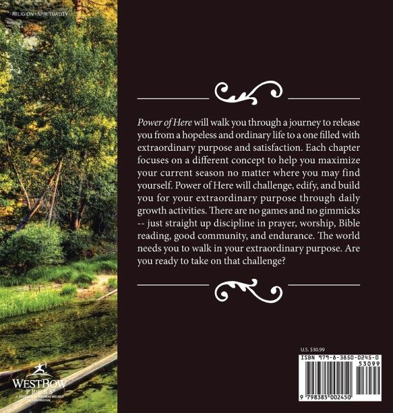 Power of Here will walk you through a journey to release you from a hopeless and ordinary life to a one filled with extraordinary purpose and satisfaction. Each chapter focuses on a different concept to help you maximize your current season no matter where you may find yourself. Power of Here will challenge, edify, and build you for your extraordinary purpose through daily growth activities. There are no games and no gimmicks -- just straight up discipline in prayer, worship, Bible reading, good community, and endurance. The world needs you to walk in your extraordinary purpose. Are you ready to take on that challenge?