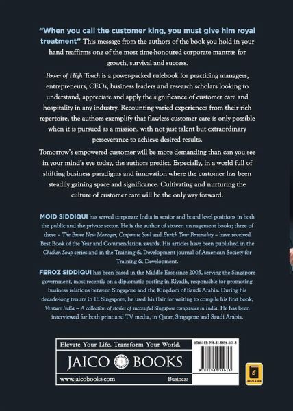 Cultivating the Culture of Customer Care "When you call the customer king, you must give him royal treatment" This message from the authors of the book you hold in your hand reaffirms one of the most time-honoured corporate mantras for growth, survival and success. Power of High Touch is a power-packed rulebook for practicing managers, entrepreneurs, CEOs, business leaders and research scholars looking to understand, appreciate and apply the significance of customer care and hospitality in any industry. Recounting varied experiences from their rich repertoire, the authors exemplify that flawless customer care is only possible when it is pursued as a mission, with not just talent but extraordinary perseverance to achieve desired results. Tomorrow's empowered customer will be more demanding than can you see in your mind's eye today, the authors predict. Especially, in a world full of shifting business paradigms and innovation where the customer has been steadily gaining space and significance. Cultivating and nurturing the culture of customer care will be the only way forward. MOID SIDDIQUI has served corporate India in senior and board level positions in both the public and the private sector. He is the author of sixteen management books; three of these - The Brave New Manager, Corporate Soul and Enrich Your Personality - have received Best Book of the Year and Commendation awards. His articles have been published in the Chicken Soup series and in the Training & Development journal of American Society for Training & Development. FEROZ SIDDIQUI has been based in the Middle East since 2005, serving the Singapore government, most recently on a diplomatic posting in Riyadh, responsible for promoting business relations between Singapore and the Kingdom of Saudi Arabia. During his decade-long tenure in IE Singapore, he used his flair for writing to compile his first book, Venture India - A collection of stories of successful Singapore companies in India. He has been interviewed for both print and TV media, in Qatar, Singapore and Saudi Arabia.