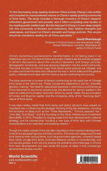 "In this fascinating study, leading American China scholar Cheng Li has written and compiled an unprecedented volume on China's rapidly growing community of think tanks. The study includes a thorough inventory of China's research institutions (government and private), and it offers compelling case studies of four leading public intellectuals. But the best part is Cheng Li's own deep insights into this community of thinkers and institutions, their relative strengths and weaknesses, and impact on China's domestic and foreign policies. This volume should be mandatory reading for all China specialists." David Shambaugh George Washington University and author of China's Future China's momentous socioeconomic transformation is not taking place in an intellectual vacuum: Chinese scholars and public intellectuals are actively engaged in fervent discussions about the country's domestic and foreign policies, demographic constraints, and ever-growing integration into the world community. This book focuses on China's major think tanks where policies are initiated, and on a few prominent thinkers who influence the way in which elites and the general public understand and deal with the various issues confronting the country. The book examines a number of factors contributing to the rapid rise of Chinese think tanks in the reform era. These include the leadership's call for "scientific decision-making," the need for specialized expertise in economics and finance as China becomes an economic powerhouse, the demand for opinion leaders in the wake of a telecommunication revolution driven by social media, the accumulation of human and financial capital, and the increasing utility of the "revolving door" nature of think tanks. It has been widely noted that think tanks and policy advisors have played an important role in influencing the strategic thinking of the top leadership, including the formation of ideas such as the "Three Represents," "China's peaceful rise," "One Belt, One Road," and the founding of the Asian Infrastructure Investment Bank (AIIB). In 2014, President Xi Jinping made think tank development a national strategy, and he claimed that "building a new type of think tank with Chinese characteristics is an important and pressing mission." Though the media outside China has often reported on this important development, it has all but escaped rigorous scholarly scrutiny. This book will categorize Chinese think tanks by their various forms, such as government agencies, university-based think tanks, private think tanks, business research centers or consultancies, and civil society groups. It will not only analyze the problems and challenges in China's think tank development, but also reveal the power of ideas.
