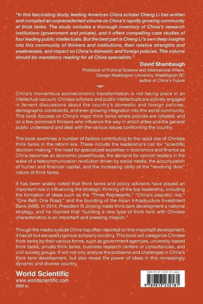 "In this fascinating study, leading American China scholar Cheng Li has written and compiled an unprecedented volume on China's rapidly growing community of think tanks. The study includes a thorough inventory of China's research institutions (government and private), and it offers compelling case studies of four leading public intellectuals. But the best part is Cheng Li's own deep insights into this community of thinkers and institutions, their relative strengths and weaknesses, and impact on China's domestic and foreign policies. This volume should be mandatory reading for all China specialists." David Shambaugh George Washington University and author of China's Future China's momentous socioeconomic transformation is not taking place in an intellectual vacuum: Chinese scholars and public intellectuals are actively engaged in fervent discussions about the country's domestic and foreign policies, demographic constraints, and ever-growing integration into the world community. This book focuses on China's major think tanks where policies are initiated, and on a few prominent thinkers who influence the way in which elites and the general public understand and deal with the various issues confronting the country. The book examines a number of factors contributing to the rapid rise of Chinese think tanks in the reform era. These include the leadership's call for "scientific decision-making," the need for specialized expertise in economics and finance as China becomes an economic powerhouse, the demand for opinion leaders in the wake of a telecommunication revolution driven by social media, the accumulation of human and financial capital, and the increasing utility of the "revolving door" nature of think tanks. It has been widely noted that think tanks and policy advisors have played an important role in influencing the strategic thinking of the top leadership, including the formation of ideas such as the "Three Represents," "China's peaceful rise," "One Belt, One Road," and the founding of the Asian Infrastructure Investment Bank (AIIB). In 2014, President Xi Jinping made think tank development a national strategy, and he claimed that "building a new type of think tank with Chinese characteristics is an important and pressing mission." Though the media outside China has often reported on this important development, it has all but escaped rigorous scholarly scrutiny. This book will categorize Chinese think tanks by their various forms, such as government agencies, university-based think tanks, private think tanks, business research centers or consultancies, and civil society groups. It will not only analyze the problems and challenges in China's think tank development, but also reveal the power of ideas.