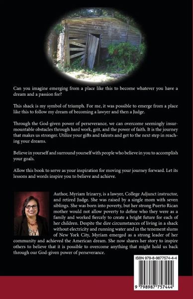 Can you imagine emerging from a shack to become whatever you have a dream and a passion for? The shack is my symbol of triumph. For me, it was possible to emerge from a place like this and follow my dream of becoming a lawyer and then a judge. Through the God-given power of perseverance, we can overcome seemingly insurmountable obstacles through hard work, grit, and the power of faith. The journey makes us stronger. Utilize your gifts and talents and get to the next step in reaching your dreams. Believe in yourself and surround yourself with people who believe in you to accomplish your goals. Allow this book to serve as your inspiration for moving your journey forward. Let its lessons and words inspire you to believe and achieve. Author, Myriam Irizarry, is a lawyer, College Adjunct instructor, and retired Judge. She was raised by a single mom with seven siblings. She was born into poverty, but her strong Puerto Rican mother would not allow poverty to define who they were as a family and worked fiercely to create a bright future for each of her children. Despite the dire circumstances of living in a shack without electricity or running water in the tenement slums of New York City, Myriam emerged as a strong leader of her community and achieved the American dream. She now shares her story to inspire others to believe that it is possible to overcome anything that might hold us back through our God-given power of perseverance.