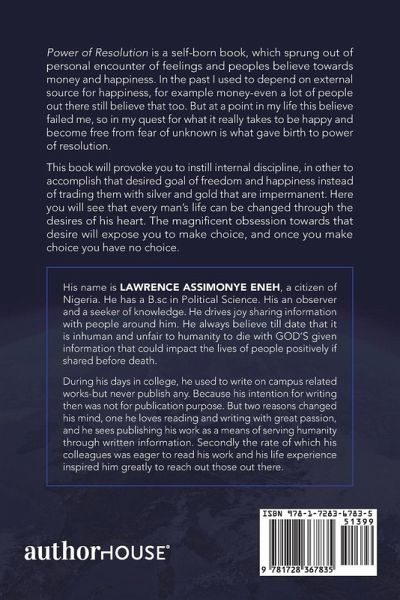 Power of Resolution is a self-born book, which sprung out of personal encounter of feelings and peoples believe towards money and happiness. In the past I used to depend on external source for happiness, for example money-even a lot of people out there still believe that too. But at a point in my life this believe failed me, so in my quest for what it really takes to be happy and become free from fear of unknown is what gave birth to power of resolution. This book will provoke you to instill internal discipline, in other to accomplish that desired goal of freedom and happiness instead of trading them with silver and gold that are impermanent. Here you will see that every man's life can be changed through the desires of his heart. The magnificent obsession towards that desire will expose you to make choice, and once you make choice you have no choice.