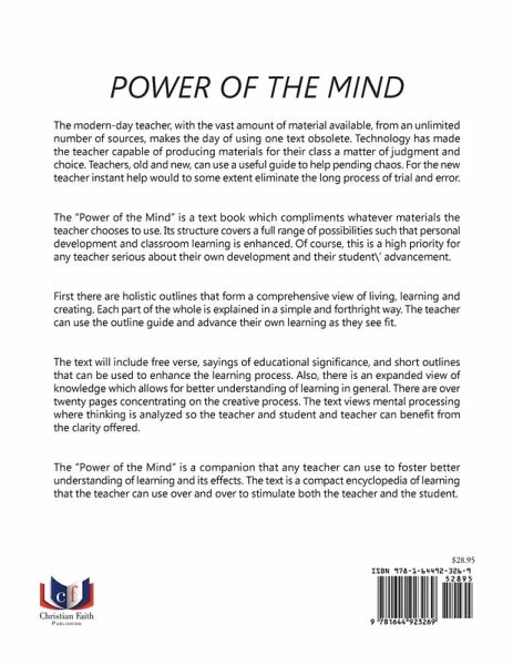 The modern-day teacher, with the vast amount of material available, from an unlimited number of sources, makes the day of using one text obsolete. Technology has made the teacher capable of producing materials for their class a matter of judgment and choice. Teachers, old and new, can use a useful guide to help pending chaos. For the new teacher instant help would to some extent eliminate the long process of trial and error. The "Power of the Mind" is a text book which compliments whatever materials the teacher chooses to use. Its structure covers a full range of possibilities such that personal development and classroom learning is enhanced. Of course, this is a high priority for any teacher serious about their own development and their student\' advancement. First there are holistic outlines that form a comprehensive view of living, learning and creating. Each part of the whole is explained in a simple and forthright way. The teacher can use the outline guide and advance their own learning as they see fit. The text will include free verse, sayings of educational significance, and short outlines that can be used to enhance the learning process. Also, there is an expanded view of knowledge which allows for better understanding of learning in general. There are over twenty pages concentrating on the creative process. The text views mental processing where thinking is analyzed so the teacher and student and teacher can benefit from the clarity offered. The "Power of the Mind" is a companion that any teacher can use to foster better understanding of learning and its effects. The text is a compact encyclopedia of learning that the teacher can use over and over to stimulate both the teacher and the student.