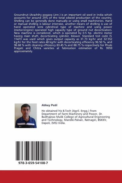 Groundnut (Arachihy pogaea Linn.) is an important oil seed in India which accounts for around 25% of the total oilseed production of the country. Shelling can be generally done manually or using small machineries. Hand or manual shelling is labour intensive, another means of shelling is use of hand operated semi cylindrical type of machine and using power (motor/engine) operated high capacity type of ground nut decorticators. New machine is considered, which is operated by 0.5 hp. electric motor having main shaft, decorticating cylinder, blower. Standard test code IS 11473 was used which gives output capacity as 31.73 kg/hr and 32.552 kg/hr for the feed rates 40 kg/hr with decorticating efficiency 96.50 %, and 96.68 % with cleaning efficiency 83.45 % and 88.75 % respectively for Phule Pragati and Chitra varieties at fabrication estimation of Rs. 9959 approximately.
