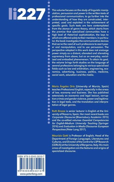 This volume focuses on the study of linguistic manipulation, persuasion and power in the written texts of professional communication, to go further into the understanding of how they are constructed, interpreted, used and exploited in the achievement of specific goals. Such texts are here contemplated from the stance of genre theory, which starts from the premise that specialised communities have a high level of rhetorical sophistication, the keys to which are offered solely to their members. In particular, the book investigates the communicative devices that serve the need of such professions to exert power and manipulation, and to use persuasion. The perspective adopted in this work does not envisage power simply as a distant, alienated and alienating supremacy from above, but as an everyday, socialized and embodied phenomenon. To attain its goal, the volume brings forth studies on the language of several professions belonging to various specialised fields such as law and arbitration, engineering, economics, advertising, business, politics, medicine, social work, education and the media.