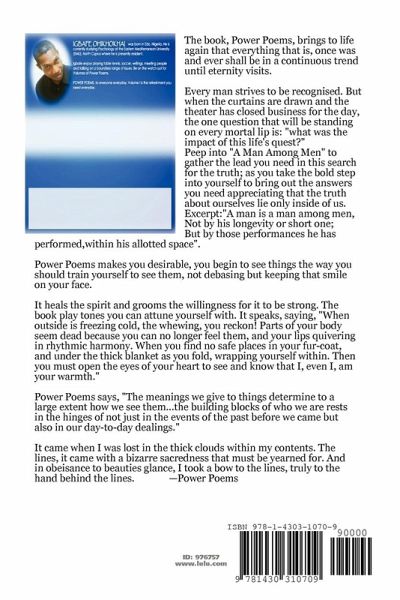 The book, Power Poems, brings to life again that everything that is, once was and ever shall be in a continuous trend until eternity visits. To get the best out of this book, you've to reflect and relate your everyday issues to it as you read it. Because the crucial moments of a man is his encounter with the constant, 'change'. Order a copy for yourself and a loved one today. It is infectious, study once and keep on studying because power poems might not know you or see your face but loves you all the same. Please send in your comments to: finxtangel@lulu.com
