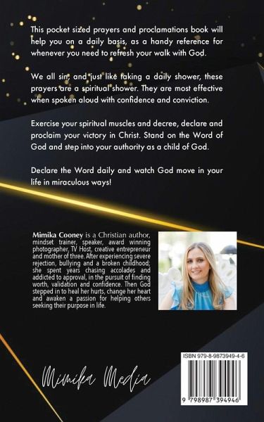 This pocket sized prayers and proclamations book will help you on a daily basis, as a handy reference for whenever you need to refresh your walk with God. We all sin, and just like taking a daily shower, these prayers are a spiritual shower. They are most effective when spoken aloud with confidence and conviction. Exercise your spiritual muscles and decree, declare and proclaim your victory in Christ. Stand on the Word of God and step into your authority as a child of God. Declare the Word of God daily and watch God move in your life in miraculous ways!
