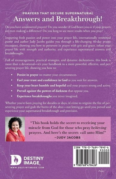 Prayers that Secure Supernatural Answers and Breakthrough! Do you have unanswered prayers? Do you wonder if God hears you or if your prayers are even making a difference? Do you long to see more results when you pray? Imparting fresh passion and power into your prayer life, internationally renowned pastor and author Judy Jacobs guides you through a life-changing 40-day prayer encounter, showing you how to persevere in prayer with grit and grace, infuse your prayer life with strength and authority, and experience supernatural answers and breakthroughs. Full of encouragement, practical strategies, and dynamic declarations, this book is more than a devotional-it's your handbook to a more powerful, effective, and persevering prayer life, showing you how to: Persist in prayer no matter your circumstances. Fuel your trust and confidence in God as you wait for answers. Keep your heart humble and hopeful and your prayers strong and active. Prevail against the powers of darkness that oppose you. Experience breakthroughs you never imagined. Whether you've been praying for decades or days, it's time to reignite the fire of persevering prayer and grab the horns of the altar-not letting go until you prevail and experience your supernatural breakthrough and provision. "This book holds the secret to receiving your miracle from God for those who pray believing prayers. And here's the secret: call unto Him!" -Judy Jacobs
