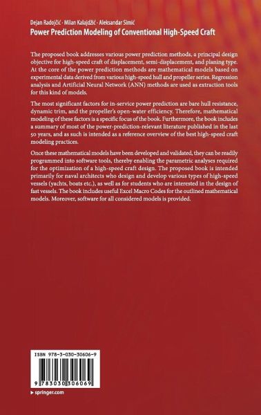 The proposed book addresses various power prediction methods, a principal design objective for high-speed craft of displacement, semi-displacement, and planing type. At the core of the power prediction methods are mathematical models based on experimental data derived from various high-speed hull and propeller series. Regression analysis and Artificial Neural Network (ANN) methods are used as extraction tools for this kind of models.The most significant factors for in-service power prediction are bare hull resistance, dynamic trim, and the propeller's open-water efficiency. Therefore, mathematical modeling of these factors is a specific focus of the book. Furthermore, the book includes a summary of most of the power-prediction-relevant literature published in the last 50 years, and as such is intended as a reference overview of the best high-speed craft modeling practices.Once these mathematical models have been developed and validated, they can be readily programmed into software tools, thereby enabling the parametric analyses required for the optimization of a high-speed craft design. The proposed book is intended primarily for naval architects who design and develop various types of high-speed vessels (yachts, boats etc.), as well as for students who are interested in the design of fast vessels. The book includes useful Excel Macro Codes for the outlined mathematical models. Moreover, software for all considered models is provided.