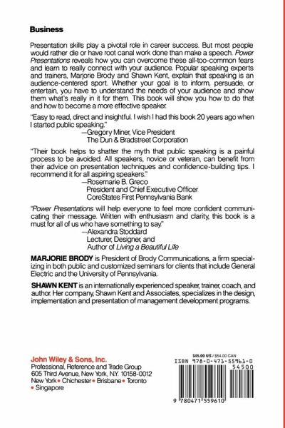 MARJORIE BRODY is President of Brody Communications, a firm specializing in both public and customized seminars for clients that include General Electric and the University of Pennsylvania. SHAWN KENT is an internationally experienced speaker, trainer, coach, and author. Her company, Shawn Kent and Associates, specializes in the design, implementation and presentation of management development programs.