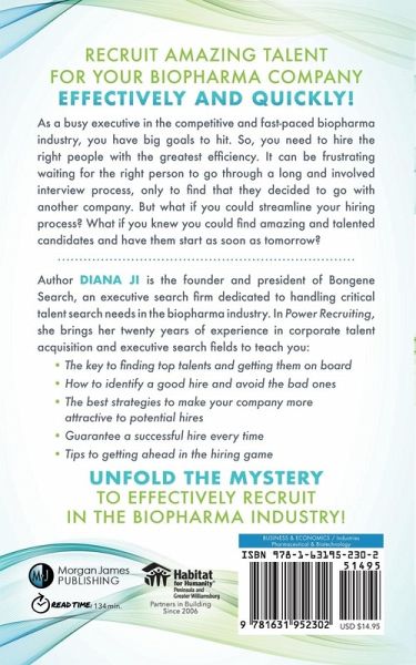 Power Recruiting unfolds the mystery of how to effectively recruit in the biopharma industry. Diana Y. Ji is the founder and president of Bongene Search, an executive search firm dedicated to handling critical talent search needs in the biopharma industry. In Power Recruiting, she brings her twenty years of experience in corporate talent acquisition and executive search fields to teach hiring managers and recruiting professionals: The key to finding top talents and getting them onboard How to identify a good hire and avoid the bad ones The best strategies to make their company more attractive to potential hires Guarantee a successful hire every time Tips to getting ahead in the hiring game