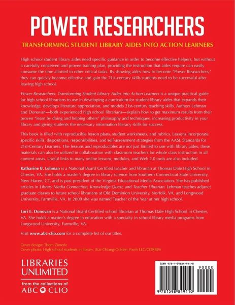 This book presents a proven year-long program to boost student productivity and train high school library aides while offering services to all patrons of the school library. Power Researchers: Transforming Student Library Aides Into Action Learners is a unique practical guide for high school librarians to use in developing a curriculum for student library aides that expands their knowledge, develops literature appreciation, and models 21st-century teaching skills. Authors Lehman and Donovan-both experienced high school librarians-explain how to get maximum results from their proven "learn by doing and helping others" philosophy and techniques, increasing productivity in your library and giving students the necessary information literacy skills for success. This book is filled with reproducible lesson plans, student worksheets, and rubrics. Lessons incorporate specific skills, dispositions, responsibilities, and self-assessment strategies from the AASL Standards for 21st Century Learners. The lessons and reproducibles are not just limited to use with library aides; these materials can also be utilized in collaboration with classroom teachers for whole class instruction in all content areas. Useful links to many online lessons, modules, and Web 2.0 tools are also included.