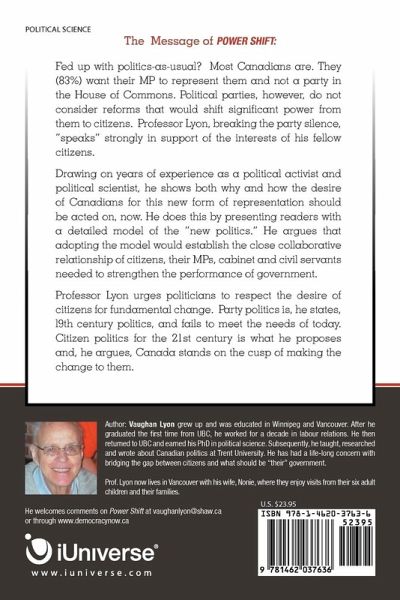 Fed up with politics as usual? Most Canadians are, and an overwhelming eighty-three percent want their MP to represent them-not a party-in the House of Commons. Without pressure from the people, however, political parties won't consider fundamental reforms to give power back to the people. In Power Shift, author Vaughan Lyon draws on his years of experience as a party activist and political scientist to delve into why and how Canadian political reform must occur. He explores Canadians' desire for a different form of representation-constituency representation-based on citizen participation in making policy and electing MPs. Lyon presents a detailed model of the new politics, shows how its adoption will improve the responsiveness of government, and outlines how it can be organized responsibly at little cost. He also explains how this model would establish the close collaborative relationship of citizens, their MPs, and government and civil servants, a bond essential for the government to meet challenges and rise to Canada's great opportunities. Conditions are ripe for change, and the time for Canadians to wrest control of their MPs from political parties is now. "That the political systems of the democratic world, and the institutions which channel political life in Canada and elsewhere, are in trouble will surprise no one. Vaughan Lyon's contribution to the agonised introspection triggered by that crisis is distinguished by the comprehensiveness of his critique and its accompanying thesis that piecemeal tinkering or adhockery cannot provide the transformative change that is required. "Very little emerges unscathed from his probing and well-documented critique. ... His prime focus is the party system, isolated by party discipline in the legislature from the citizenry it is supposed to serve. The thesis that parties are instruments of democratic citizenship is 'the great delusion.' In fact they are 'a barrier to a twenty-first-century democracy.' "... Vaughan Lyon's goal is an empowered citizenry, the necessary support for the strengthened government needed to grapple with twenty-first century challenges. The alienation of citizens from government is to be reversed with government 'firmly rooted in the citizenry.' ... Professor Lyon advocates a 'quiet Canadian democratic revolution.' He invites the reader to accompany him on the path to that future." -Alan Cairns, past president of the Canadian Political Science Association