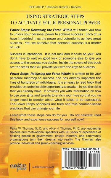 Power Steps: Releasing the Force Within will teach you how to unlock your personal power to achieve success. Each of us have imbedded in us the power and potential to achieve great success. Yet, we perceive that personal success is a matter of luck. Success is intentional. It is not luck and it could be you! You don't have to wait on good luck or someone else to give you access to the success you desire. Inside the covers of this book are the steps that will provide you with the keys to success. Power Steps: Releasing the Force Within is written to be your personal roadmap to success and has already impacted the lives of hundreds of individuals. It is an easy to read book that provides an unbelievable opportunity to awaken in you the skills that you already have. It provides you with information on how to use your gifts and talents to enrich your lives so that you no longer need to wonder about what it takes to be successful. The Power Steps principles are tried and true common-sense practices that can change your life. Learn what these steps can do for you. Do not hesitate; read this book and experience success for yourself now!