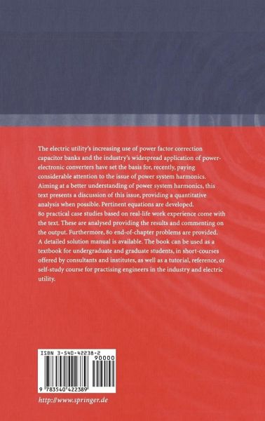 The electric utility's increasing use of power factor correction capacitor banks and the industry's widespread application of power-electronic converters have set the basis for, recently, paying considerable attention to the issue of power system harmonics. Aiming at a better understanding of power system harmonics, this text presents a discussion of this issue, providing a quantitative analysis when possible. Pertinent equations are developed. 80 practical case studies based on real-life work experience come with the text. These are analysed providing the results and commenting on the output. Furthermore, 80 end-of-chapter problems are provided. A detailed solution manual is available. The book can be used as a textbook for undergraduate and graduate students, in short-courses offered by consultants and institutes, as well as a tutorial, reference, or self-study course for practising engineers in the industry and electric utilities.