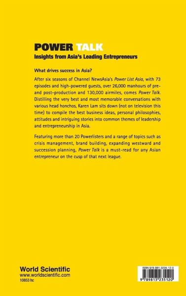 What drives success in Asia? How did the pioneers do what they did, how are they planning their succession? What are their views on life and family? After six seasons of Channel News Asia's Power List Asia, with 73 episodes high-powered guests, over 26,000 manhours of pre- and post-production and 130,000 airmiles, comes Power Talk. Distilling the very best and most memorable conversations with various head honchos, Karen Lam sits down (not on television this time) to compile the best business ideas, personal philosophies, attitudes and intriguing stories into common themes of leadership and entrepreneurship in Asia. Featuring more than 20 Powerlisters and a range of topics such as crisis management, brand building, expanding westward and succession planning, Power Talk is a must-read for any Asian entrepreneur on the cusp of that next league.