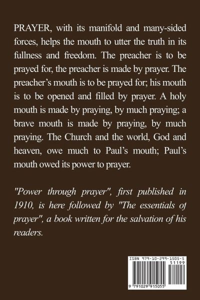 PRAYER, with its manifold and many-sided forces, helps the mouth to utter the truth in its fullness and freedom. The preacher is to be prayed for, the preacher is made by prayer. The preacher's mouth is to be prayed for; his mouth is to be opened and filled by prayer. A holy mouth is made by praying, by much praying; a brave mouth is made by praying, by much praying. The Church and the world, God and heaven, owe much to Paul's mouth; Paul's mouth owed its power to prayer. "Power through prayer", first published in 1910, is here followed by "The essentials of prayer", a book written for the salvation of his readers. This Premium Edition comes with an Easy to Read Layout making reading comfortable.