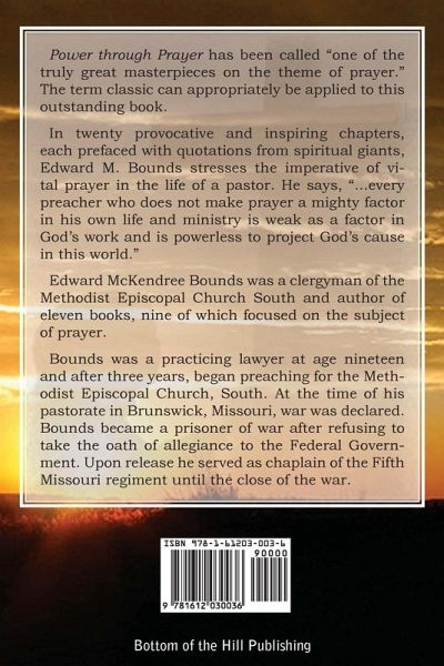 "Power through Prayer has been called "one of the truly great masterpieces on the theme of prayer." The term classic can appropriately be applied to this outstanding book. In twenty provocative and inspiring chapters, each prefaced with quotations from spiritual giants, Edward M. Bounds stresses the imperative of vital prayer in the life of a pastor. He says, "...every preacher who does not make prayer a mighty factor in his own life and ministry is weak as a factor in God's work and is powerless to project God's cause in this world." Edward McKendree Bounds was a clergyman of the Methodist Episcopal Church South and author of eleven books, nine of which focused on the subject of prayer. Bounds was a practicing lawyer at age nineteen and after three years, began preaching for the Methodist Episcopal Church, South. At the time of his pastorate in Brunswick, Missouri, war was declared. Bounds became a prisoner of war after refusing to take the oath of allegiance to the Federal Government. Upon release he served as chaplain of the Fifth Missouri regiment until the close of the war.