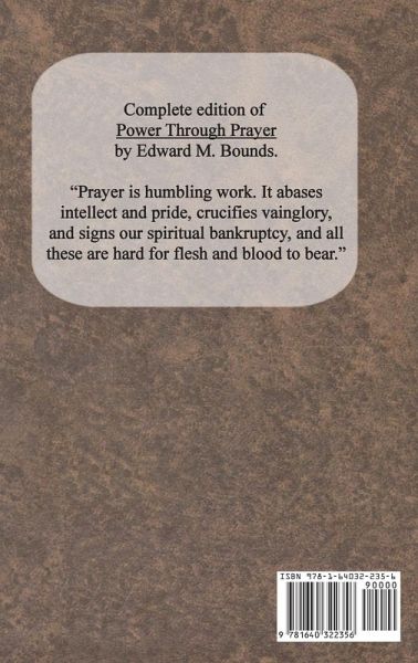 Complete edition of Power Through Prayer by Edward M. Bounds. This is a short classic on prayer, and Bounds first published prayer book for the layman. Read with an open heart, this book is helpful to read again and again at various stages of life. "Prayer is humbling work. It abases intellect and pride, crucifies vainglory, and signs our spiritual bankruptcy, and all these are hard for flesh and blood to bear." No student of thought should be without this historic book. This edition is provided in a slim volume with full text at an affordable price. TABLE OF CONTENTS 1. Men of Prayer Needed 2. Our Sufficiency Is of God 3. The Letter Killeth 4. Tendencies to Be Avoided 5. Prayer, the Great Essential 6. A Praying Ministry Successful 7. Much Time Should Be Given to Prayer 8. Examples of Praying Men 9. Begin the Day with Prayer 10. Prayer and Devotion United 11. An Example of Devotion 12. Heart Preparation Necessary 13. Grace from the Heart Rather Than the Head 14. Unction A Necessity 15. Unction, the Mark of True Gospel Preaching 16. Much Prayer the Price of Unction 17. Prayer Marks Spiritual Leadership 18. Preachers Need the Prayers of the People 19. Deliberation Necessary to Largest Results from Prayer 20. A Praying Pulpit Begets A Praying Pew