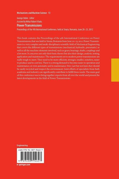 This books contains the Proceedings of the 4th International Conference on Power Transmissions, that was held in Sinaia, Romania from June 20 -23, 2012. Power Transmissions is a very complex and multi-disciplinary scientific field of Mechanical Engineering that covers the different types of transmissions (mechanical, hydraulic, pneumatic) as well as all the machine elements involved, such as gears, bearings, shafts, couplings and a lot more. It concerns not only their basic theory but also their design, analysis, testing, application and maintenance. The requirements set to modern power transmissions are really tough to meet: They need to be more efficient, stronger, smaller, noiseless, easier to produce and to cost less. There is a strong demand to become easier in operation and maintenance, or even automatic and in maintenance-free. Last but not least, they should be easily recycled and respect the environment. Joint efforts of specialists from both academia and industry can significantly contribute to fulfill these needs. The main goal of this conference was to bring together experts from all over the world and present the latest developments in the field of Power Transmissions.