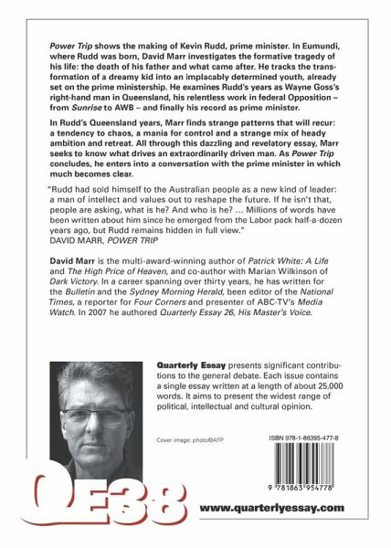 Power Trip shows the making of Kevin Rudd, prime minister. In Eumundi, where Rudd was born, David Marr investigates the formative tragedy of his life: the death of his father and what came after. He tracks the transformation of a dreamy kid into an implacably determined youth, already set on the prime ministership. He examines Rudd's years as Wayne Goss's right-hand man in Queensland, his relentless work in federal Opposition - from Sunrise to AWB - and finally his record as prime minister. In Rudd's Queensland years, Marr finds strange patterns that will recur: a tendency to chaos, a mania for control and a strange mix of heady ambition and retreat. All through this dazzling and revelatory essay, Marr seeks to know what drives an extraordinarily driven man. As Power Trip concludes, he enters into a conversation with the prime minister in which much becomes clear. "Rudd had sold himself to the Australian people as a new kind of leader: a man of intellect and values out to reshape the future. If he isn't that, people are asking, what is he? And who is he? ... Millions of words have been written about him since he emerged from the Labor pack half-a-dozen years ago, but Rudd remains hidden in full view." David Marr, Power Trip This issue also contains correspondence discussing Quarterly Essay 37, What's Right?, from John Hirst, George Brandis, Tom Switzer, Andrew Norton, George Megalogenis, Jean Curthoys, Martin Krygier, and Waleed Aly