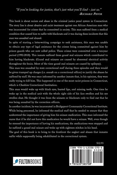 This book is about racism and abuse in the criminal justice penal system in Connecticut. The story line is about abusive and racist treatment against one African American man who was incarcerated for crimes that he committed in society. This man suffered from a medical condition that caused him to suffer with blackouts and it was during these incidents that this man was assaulted and abused. In spite of starting a letter-writing campaign to seek assistance, this man was unable to obtain any type of legal assistance for the crimes being committed against him by prison guards who are now called police. These crimes were committed over a ten-year period (1992-2010). This inmate suffered from grand mal seizures which contributed to him having blackouts. (Grand mal seizures are caused by abnormal electrical activity throughout the brain. Most of the time grand mal seizures are caused by epilepsy). This man was assaulted by state correctional staff during these episodes and then would be given trumped up charges (i.e. assault on a correctional officer) to justify the abuses he suffered by staff. He was once informed by another inmate that, in his opinion, they were really trying to kill him. This happened in one of the most racist prisons in Connecticut, which is Cheshire Correctional Institution. This man would wake up with black eyes, busted lips, and missing teeth. One time he woke up in the medical unit with the whole right side of his face swollen and his eye swollen shut. He thought it was from the seizures or blackouts only to find out that he was being assaulted by the correction officers. In another incident, he was incarcerated in Bridgeport Community Correctional Institute. While being processed, he informed the medical staff that he needed to ensure that they understood the importance of giving him his seizure medication. This man informed the nurse that if he did not have this medication he would have a seizure. Well, even though he stressed the importance of having his medications, the medications were stopped and he suffered a grand mal seizure and woke up with eighteen stitches in his head. The goal of this book is to bring to the forefront the neglect and abuses that inmates suffer while supposedly being rehabilitated in the correctional system.