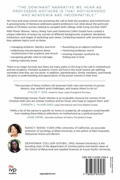 IVP Readers' Choice Award "The dominant narrative we hear as professor mothers is that motherhood and academia are incompatible." Two challenging vocations, each filled with complexities and daily ups and downs. Yet more and more women are answering the call to both the academy and motherhood. A growing body of literature addresses parent-professors, but what about the particular needs of Christian women seeking to navigate both callings while living out their faith? With Power Women, Nancy Wang Yuen and Deshonna Collier-Goubil have curated a unique resource by and for Christian academic mothers. This collection of essays includes the voices of women of different backgrounds, academic disciplines, institutions, and stages of parenting and career. Together contributors provide wisdom, encouragement, and solidarity for women who share a similar vocational journey. Combining research with personal stories, they address topics such as these: how parenting and teaching can be mutually enriching managing ambition, identity, and time addressing misconceptions about motherhood in the academy, church, and society navigating gender roles in marriage taking maternity leave flourishing as an adjunct professor mentoring professor moms resisting imposter syndrome by finding rest in God There is no magic formula, but there are many paths to thriving in the call to motherhood and the academy. Christian academic moms will find in this book honest yet uplifting reminders that they are not alone. In addition, administrators, family members, and friends will grow in understanding and appreciation of the power women in their lives.