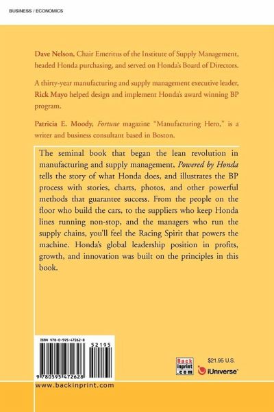 Powered by Honda tells the story of what Honda does, and illustrates the BP process with stories, charts, photos, and other powerful methods that guarantee success. From the people on the floor who build the cars, to the suppliers who keep Honda lines running non-stop, and the managers who run the supply chains, you'll feel the Racing Spirit that powers the machine. Honda's global leadership position in profits, growth, and innovation was built on the principles in this book.