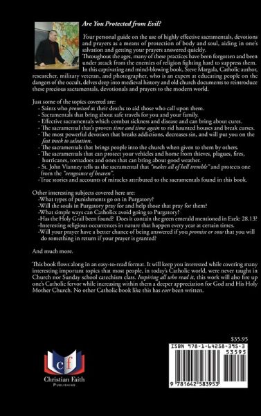 Your personal guide on the use of highly effective sacramentals, devotions and prayers as a means of protection of body and soul, aiding in one's salvation and getting your prayers answered quickly. Throughout the ages, many of these practices have been forgotten and been under attack from the enemies of religion fighting hard to suppress them. In this captivating and mind-blowing book, Steve Margala, Catholic author, researcher, military veteran, and photographer, who is an expert at educating people on the dangers of the occult, delves deep into medieval history and old church documents to reintroduce these precious sacramentals, devotionals and prayers to the modern world. Just some of the topics covered are: - Saints who promised at their deaths to aid those who call upon them. - Sacramentals that bring about safe travels for you and your family. - Effective sacramentals which combat sickness and disease and can bring about cures. - The sacramental that's proven time and time again to rid haunted houses and break curses. - The most powerful devotion that breaks addictions, decreases sin, and will put you on the fast track to salvation. - The sacramentals that brings people into the church when given to them by others. - The sacramentals that can protect your vehicles and home from thieves, plagues, fires, hurricanes, tornadoes and ones that can bring about good weather. - St. John Vianney tells us the sacramental that "makes all of hell tremble" and protects one from the "vengeance of heaven". -True stories and accounts of miracles attributed to the sacramentals found in this book. Other interesting subjects covered here are: -What types of punishments go on in Purgatory? -Will the souls in Purgatory that we pray for act on our behalf when we are judged? -What simple ways can we avoid going to Purgatory ourselves? -Has the Holy Grail been found? Does it contain the green emerald mentioned in Ezek: 28.13? -Interesting religious occurrences in nature that happen every year at certain times. -Will your prayer have a better chance of being answered if you promise or vow that you will do something in return if your prayer is granted? And much more. This book flows along in an easy-to-read format. It will keep you interested while covering many interesting important topics that most people, in today's Catholic world, were never taught in Church nor Sunday school catechism class. This work will inspire all who read it, encouraging and firing up one's religious fervor and increasing within them a deeper appreciation for God and His Holy Mother Church. No other Catholic book like this has ever been written.