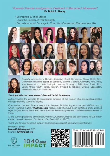 "Powerful Female Immigrants is Destinedto Become A Movement" Dr. Dalal A Akoury ¿ Be Inspired By Their Stories ¿ Learn the Secrets of Their Strength ¿ Find Wisdom and Courage to Chart Your Course and Create a New Life Powerful women from Albania, Argentina, Brazil, Cameroon, China, Costa Rica, Dominican Republic, Egypt, El Salvador, Estonia, Georgia, Germany, Haiti, India, Iran, Kazakhstan, Latvia, Malaysia, Mexico, Nicaragua, Philippines, Puerto Rico, South Africa, South Korea, Taiwan, Trinidad & Tobago, Ukraine, Uzbekistan, Venezuela, Vietnam and more. Migena Agaraj, Nadire Fasko Agaraj, Ana Megrelishvili, Dr Farah Sultan, Eda Walldorf, Paulina Amador, Puja Sohi and Avneet Kaur, Liza Quinones, Anne Price, Vien Nguyen, Ngoc T. Tran, Wilete Nguyen, Evelin Marsh, Denise Pham, Elise Lin, Shelly Ann Miles, Mary Cardenas, Barbara Heil-Sonneck, Susan Noh, Lorraine Chai, Denise Pham, Yuwen "Wendy" Juan, Roushel Eid, Kelli & Mari Ann Nguyen Ha and Haven Le. The ripple effect of these women's lives will be felt for eternity! From the Publisher: As I've traveled the world in 30 countries I'm amazed at the women who are creating positive change affecting culture for legacy. One hundred percent of the proceeds from the sale of this book goes to support 1040impact.org which I founded in 2021. 1040Impact.org rescues kids who have been trafficked and orphaned ages 4-17, we rescue them, feed them, educate them and give them a safe home environment to thrive. At the current publishing of this book, Volume 3, October 2023 we are daily caring for 375 kids in 4 safe houses in Asia and Oklahoma USA. Thank you for your generous support and helping us impact so many lives in this way. Michael D. Butler Beyond Publishing, CEO Founder https://1040Impact.org Donate Directly at: https://GiveButter.com/1040 Michael D. Butler BeyondPublishing.net CEO Founder 1040Impact.org