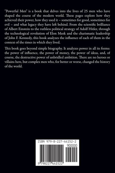 Imagine having in your hands the power to understand the minds, decisions, and legacies of the 25 most influential men of the 20th and 21st centuries. Men whose ideas, actions, and ambitions not only transformed politics, science, art, and commerce, but shaped the world as we know it today. Some were admirable visionaries, while others unleashed chaos and controversy. All, without exception, left an indelible mark on history. Introducing "Powerful Men," a book that delves into the lives of these key figures, exploring how they achieved their power, how they used it - sometimes for good, sometimes for evil - and what legacy they have left behind. From the scientific brilliance of Albert Einstein to the ruthless political strategy of Adolf Hitler, through the technological revolution of Elon Musk and the charismatic leadership of John F. Kennedy, this book analyzes the influence of each of them in the context of the times in which they lived. This book goes beyond simple biography. It examines power in all its forms: the power of influence, the power of money, the power of ideas, and of course, the destructive power of unbridled ambition. Here you will find not just heroes or just villains, but complex men who, for better or worse, changed the history of the world. "Powerful Men" is not just a tour of the lives of these figures; it is a profound reflection on how power, in its many facets, shapes our collective destiny. Through an accessible style and rigorous research, we offer you a window into the thinking and decisions that led these individuals to the top of their respective fields. This book is for you if: You are fascinated by history and want to learn more about the figures who marked the course of the 20th and 21st centuries. You want to understand the impact of power, both when it is used to create and when it is used to destroy. You are looking for valuable lessons to help interpret the current and future challenges of our society. By purchasing Powerful Men, you are not only getting a gripping account of life and leadership, but also a tool for better understanding the forces that shape our world. These stories offer inspiration, warnings, and, above all, a deeper understanding of power and its ability to transform the course of history. Don't miss your chance to explore the lives of the men who have defined our era.