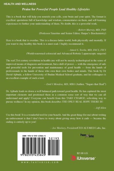 The official handbook of the Wellness Revolution! Addresses all the forces that govern mental and physical well being. Empowers the reader to take a more proactive role towards his or her health. What is becoming more and more evident is that our ability to create and maintain a state of vibrant health is influenced by several factors including spiritual, emotional, social, environmental and nutritional factors. With foreword by mind-body medicine pioneer, Bernie Siegel, MD, and contributions from the world's leading scientists, philosophers and experts in the field of human potential, Powerful People Lead Healthy Lifestyles explores these influences, recent breakthroughs in our understanding of nutrition, mind-body medicine and aging, and shows how the average person can use them to full advantage.