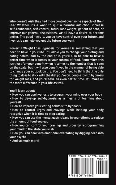 Who doesn't wish they had more control over some aspects of their life? Whether it's a want to quit a harmful addiction, increase self-confidence, self-control, focus, lose weight, get out of debt, or improve our general dispositions, we all have a desire to become better. The good news is, you do have control over your future, and hypnosis can help you get the future you want. Powerful Weight Loss Hypnosis for Women is something that you need to have in your life. It'll allow you to change your dieting and eating habits, and by the end of it, you'll also be able to have a better time when it comes to your control of food. Remember, this isn't just for your benefit when it comes to the number that is seen on the scale, but it will also benefit you in the manner of being able to change your outlook on life. You don't need to think that the only thing to do is to stick with the diet you're on. Couple it with hypnosis for weight loss, and you'll have an even better time. It'll make all the more difference in your life as well. You'll learn about:How you can use hypnosis to program your mind over your body How to develop self-hypnosis as a means of learning about yourself How to improve your eating habits with hypnosis How to control urges and cravings while helping your body recognize when it is time to stop eating How you can use the mental gastric band in your efforts to reduce the amount of food you eat How you can control your cravings and urges by reprogramming your mind to the state you wish How you can deal with emotional overeating by digging deep into your psyche And so much more! So, what are you waiting for? Buy this book now to get started!